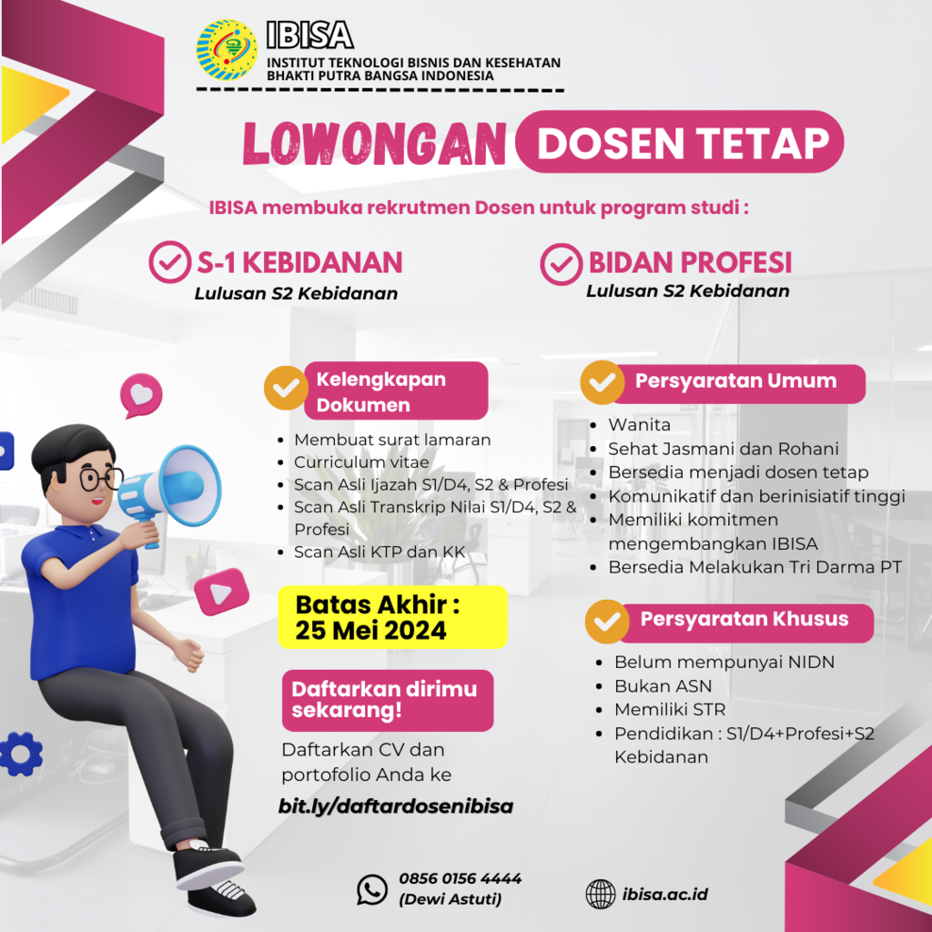 Institut Teknologi Bisnis dan Kesehatan Bhakti Putra Bangsa Indonesia (IBISA) membuka lowongan kerja 2024 posisi dosen. Pendaftaran lowongan kerja 2024 sebagai dosen di IBISA kali ini dibuka hingga 25 Mei 2024. Setidaknya ada 2 formasi yang bakal dibuka pada lowongan …