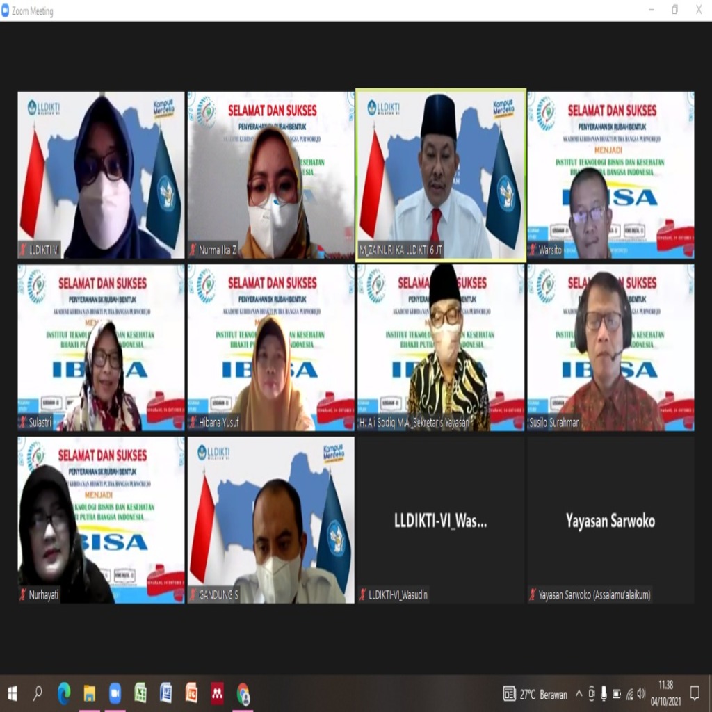 Kepala LLDIKTI Wilayah VI Jawa Tengah, Prof Dr Ir Muhammad Zainuri DEA, beserta jajarannya menyerahkan Surat Keputusan (SK) rubah bentuk sekaligus pembukaan Prodi Baru kepada Yayasan Bhakti Putra Bangsa yang menaungi perguruan tinggi Institut Teknologi Bisnis dan Kesehatan Bhakti Putra Bangsa Indonesia (IBISA). SK Prodi baru yang diserahkan meliputi Informatika (S1), Bisnis Digital (S1), Sains Data (S1),Kebidanan (D-III), penyerahan dilaksanakan secara daring menggunakan Zoom meeting pada hari Senin (04/10/2021).